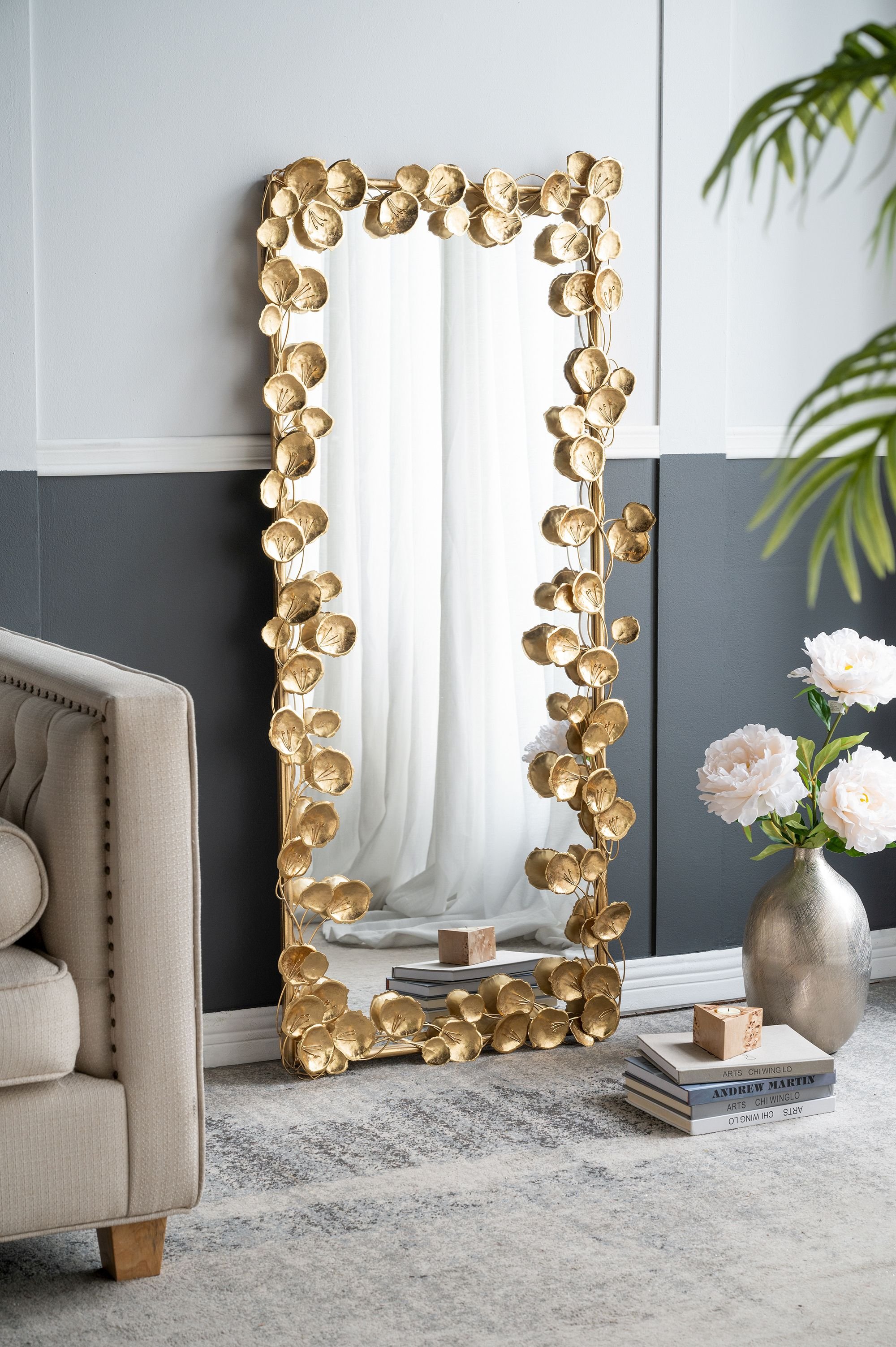 With its grand rectangle silhouette, solid iron and eco-friendly MDF wood construction, and playful golden leaf accents, this decorative full-length mirror will infuse your space with an eye-catching whimsy. Measuring a large 61H x 31W x 3D, it will easily capture your whole reflection while also adding a burst of fun to your daily routine.