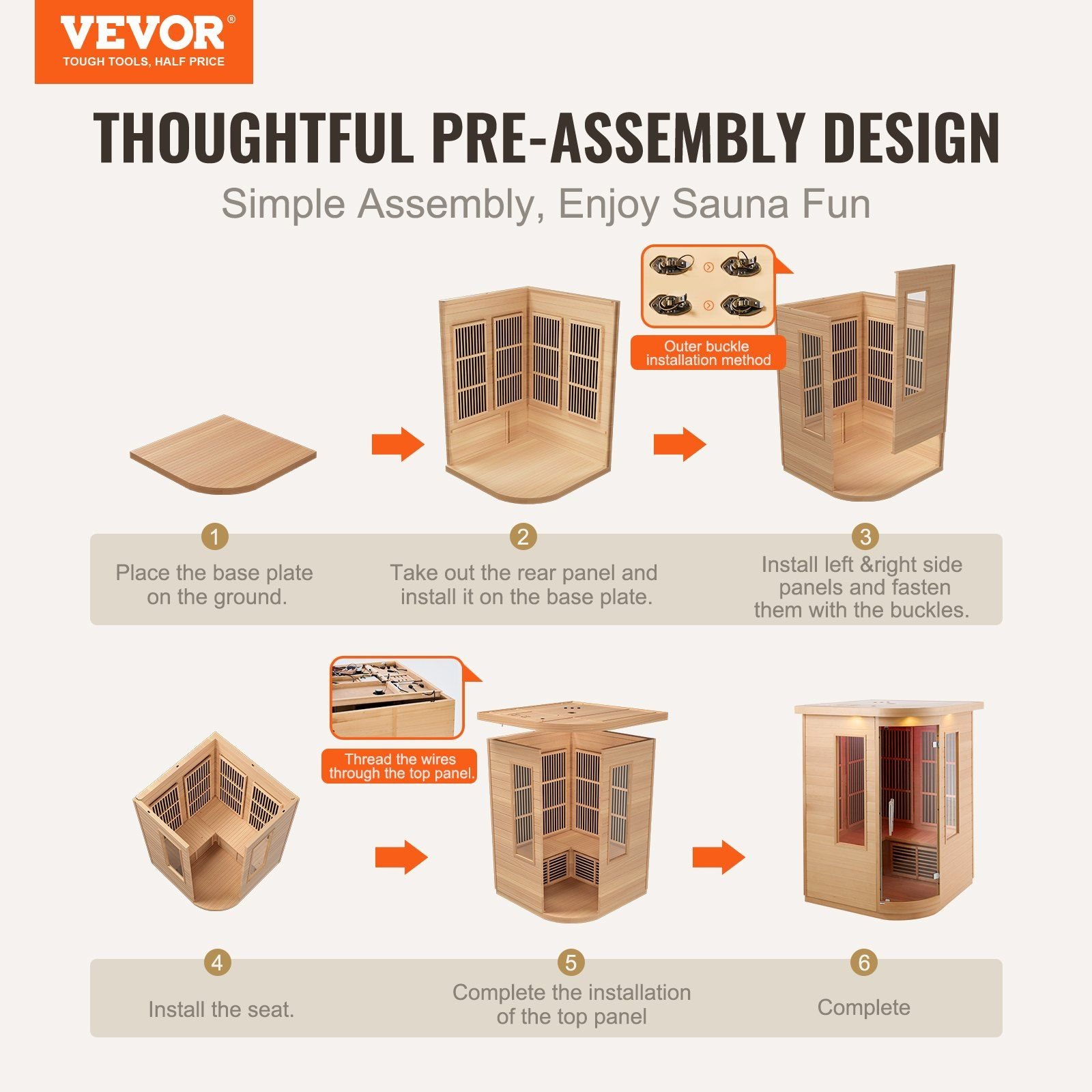 1.Pre-Assembled Design: The sauna room features a pre-assembled design, requiring only simple assembly upon receipt. Clear installation instructions and wiring diagrams are provided, eliminating the hassle of complicated screw fittings.