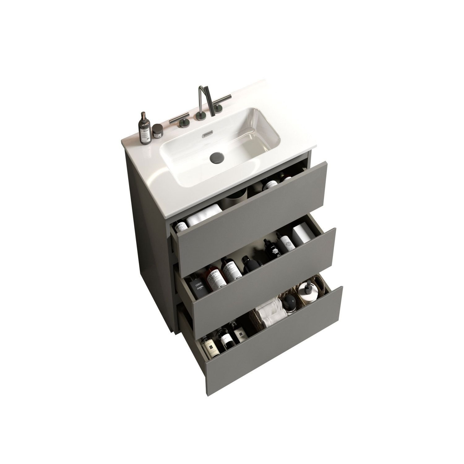 [Sleek gray finish], [Maximized storage space], [Silent and smooth operation]Step into a world of contemporary sophistication with Tia , the space grey freestanding bathroom vanity that will transform your bathroom into a luxurious oasis. With its sleek gray finish and glossy white engineered stone basin, Tia exudes a timeless charm that effortlessly blends style and functionality.Maximize your storage space with Tia triple drawers, ingeniously designed to optimize drawer space and increase storage capacity by a remarkable 20%. No more cluttered countertops or overflowing cabinets - Tia has got you covered!