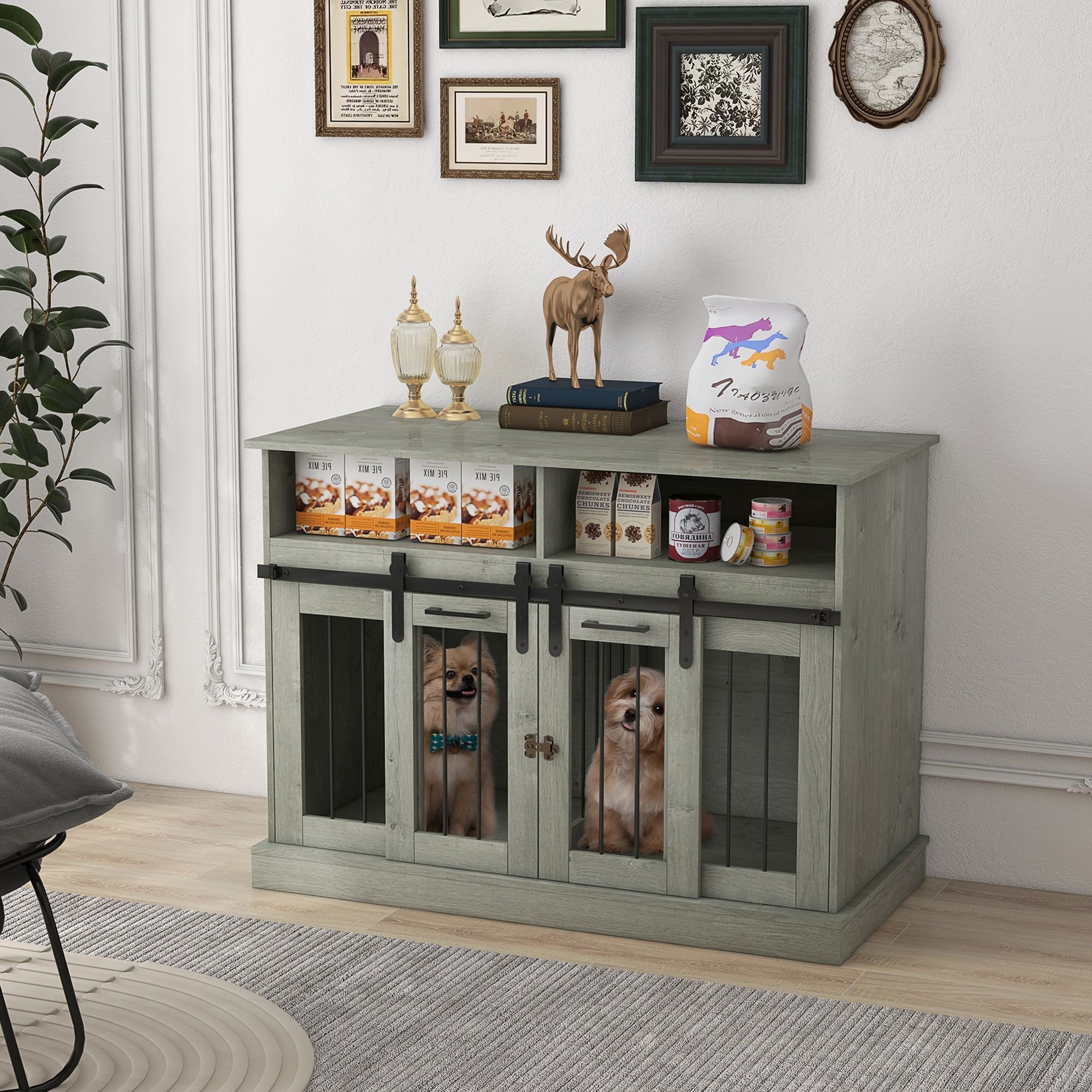 Whether you have small dogs or a big dog, this PawHut dog crate will offer the space needed to fit your furry family member. Our modern dog crate end table brings a wide tabletop, a spacious spot for pup, and two large shelves together, creating a dual-function piece of furniture. Provide room for two dogs, or remove the center and have room for a large dog. The sliding doors are efficient and lock to keep your doggie safe when you're away.