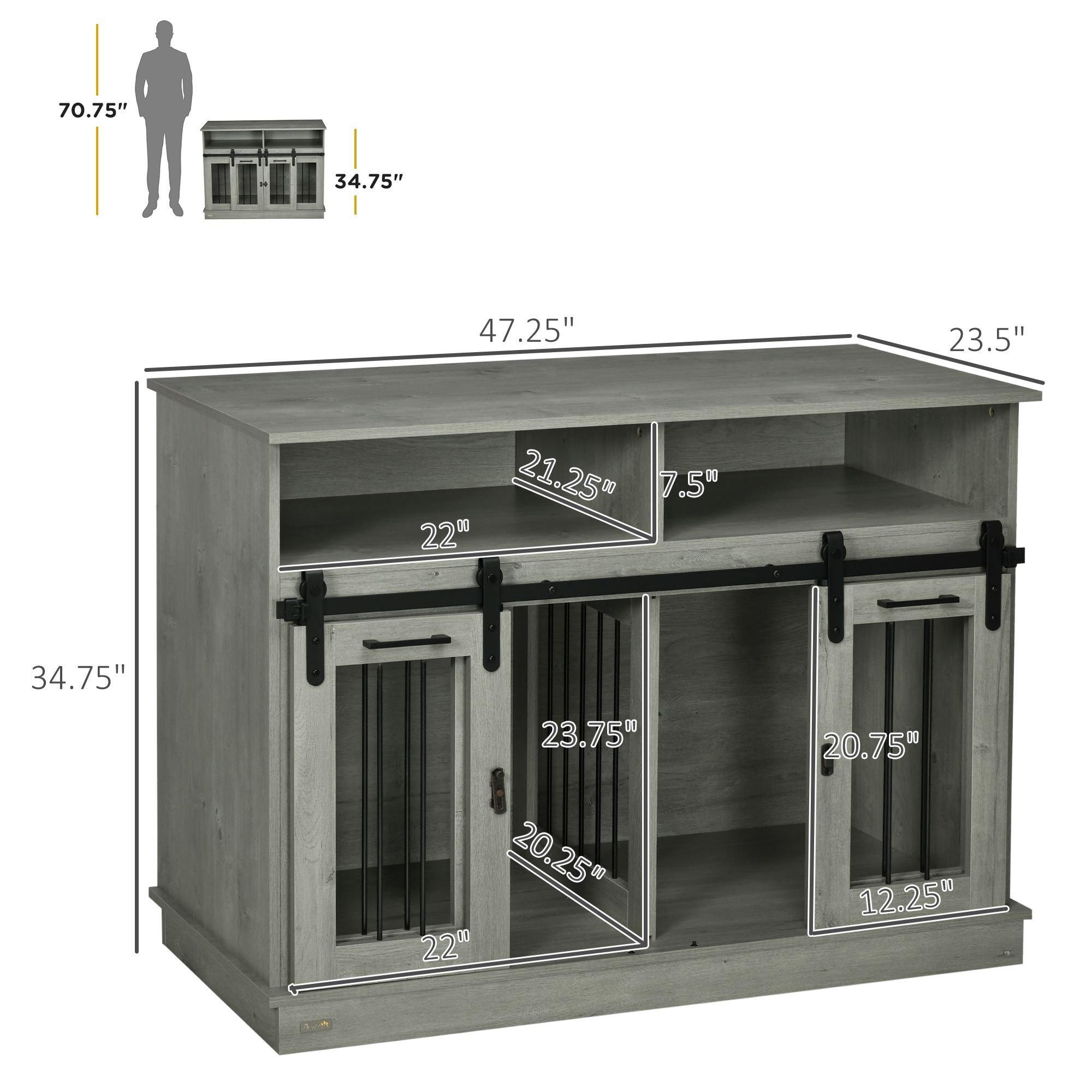 5.- Dog Kennel Furniture Info: Overall Dimensions: 47.25"" W x 23.5"" D x 34.75"" H. Interior: 44.75"" L x 20.25"" W x 23.75"" H. Large Single Room: for dogs under 23.5"" in body length, up to 66 lbs. Two Rooms: for small dogs under 13.75"" in body length, up to 18 lbs. Assembly required..